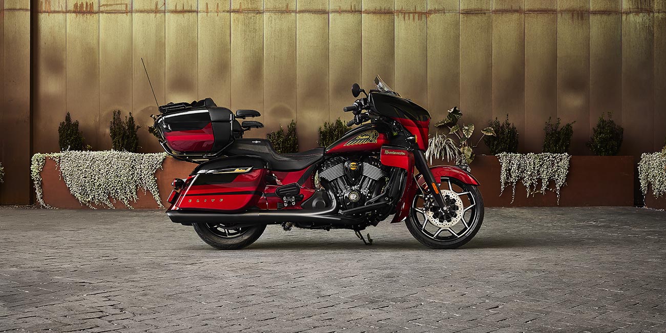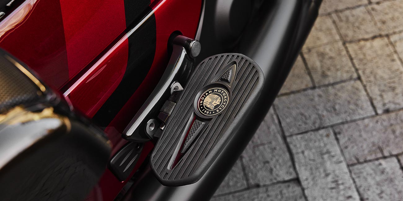 En 1904, Indian Motorcycle lance pour la première fois la peinture Indian Motorcycle Red emblématique de la marque. Aujourd’hui, nous sommes ravis de mettre à l’honneur cette teinte signature avec une toute nouvelle gamme de peintures tricolore Indian Motorcycle Red avec une finition Candy haut de gamme. À l’occasion de cet anniversaire, la console centrale arbore la silhouette d'une Indian Camelback 1904, le premier modèle d’Indian Motorcycle paré de l’emblématique peinture Indian Motorcycle Red.