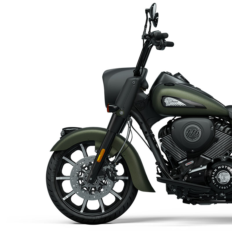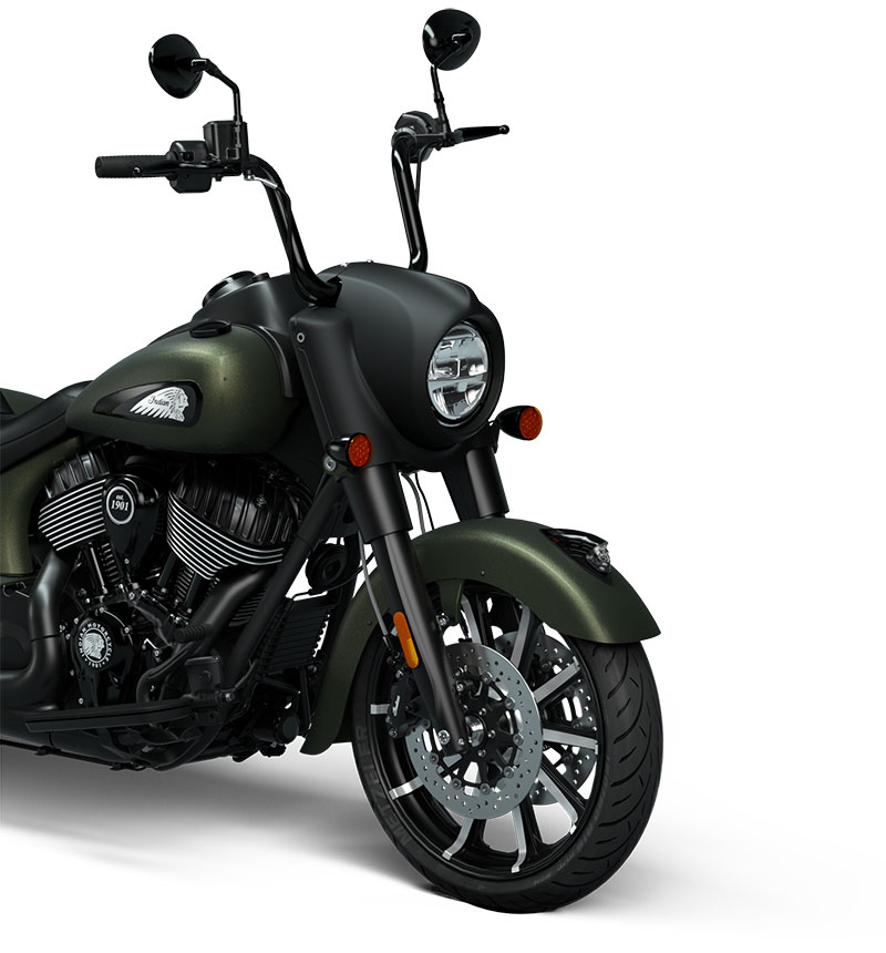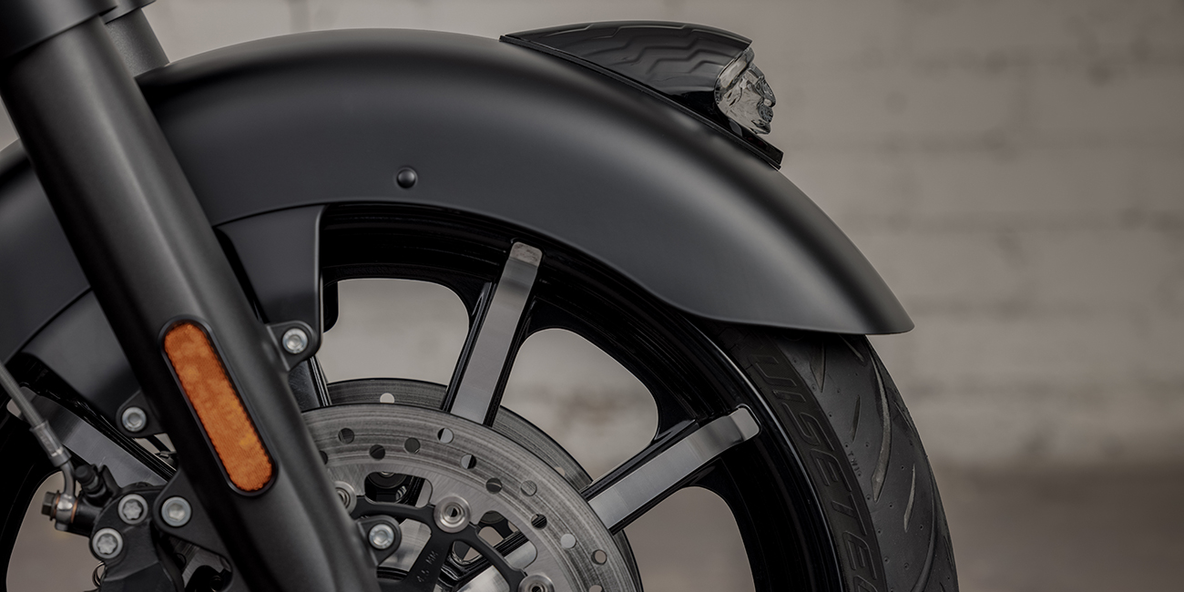 S’inspirant du look des motos customisées, le garde-boue avant avec sa coiffe d’Indien iconique met en valeur la jante à batons de 19 pouces.