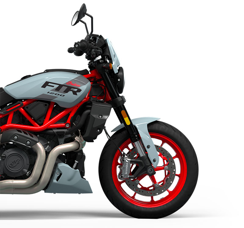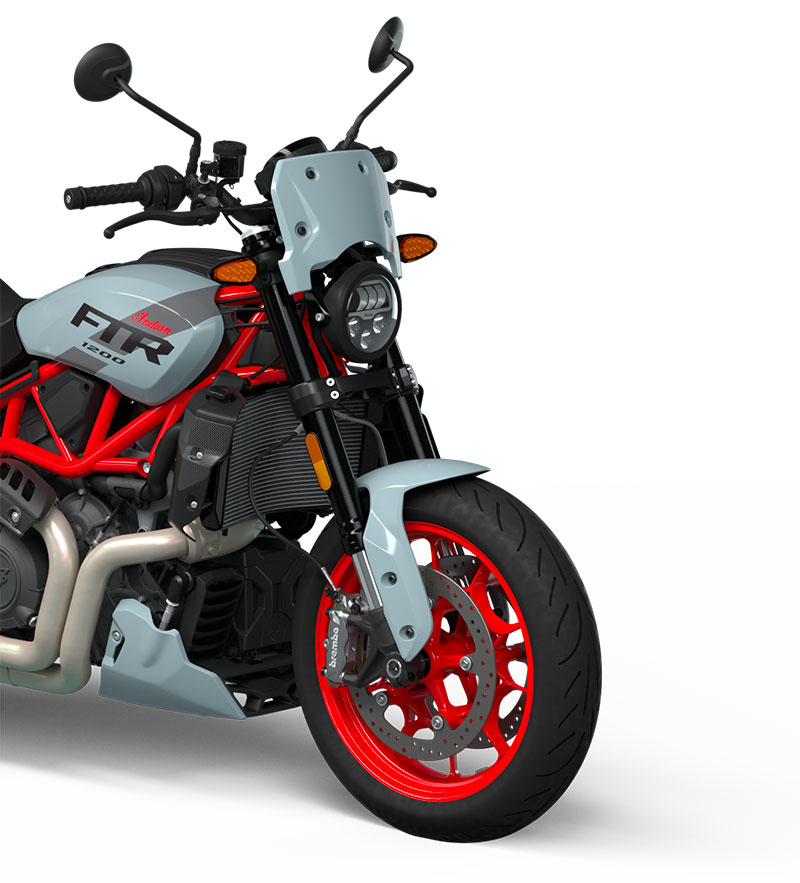 La FTR se démarque en arborant fièrement une fourche avant inversée de 43 mm entièrement réglable, ainsi qu’un amortisseur arrière unique et apparent. Les étriers monoblocs à 4 pistons et double disque de 320 mm, signés Brembo®, sont spécifiquement réglés pour un contrôle et une puissance de freinage époustouflants.